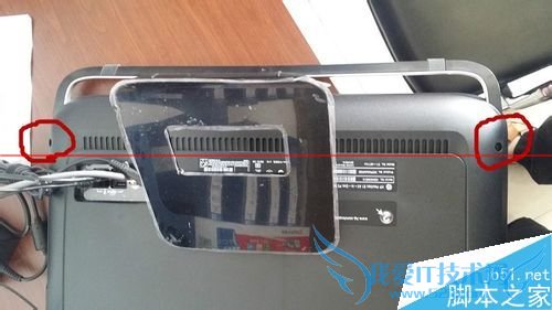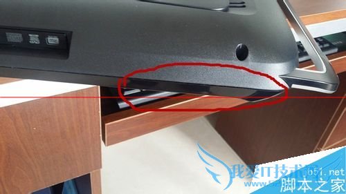 3、在一体机的底座中间有一个活扣,在螺丝完全扭开的情况下,用力按下这个活扣,机箱下部会稍稍弹起一点。