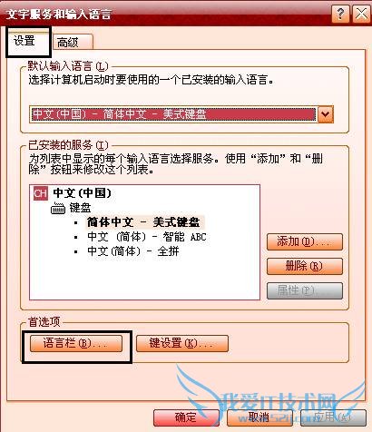4.将上方选项卡切换到“设置”,选择“语言栏”按钮