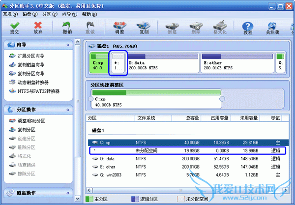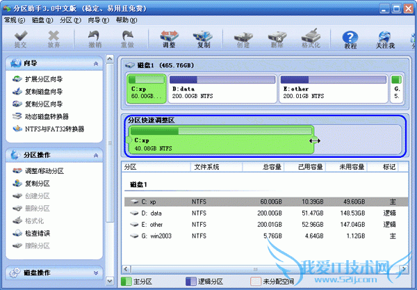 2、这步的目标是缩小C盘,请选中C盘并移动鼠标到“分区快速调整区”的最右端,然后当鼠标指针变成双向箭头时,点击圆形的手柄并向左拖动鼠标来缩小这个分区到40GB,如下图2所示:(你也可以右击C盘选择“调整/移动分区”选项来缩小C分区)