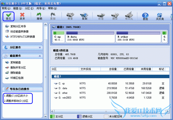 6、最后不要忘记点击工具栏上的“提交”按钮来执行真实的操作,另外你可以在主界面上看到等待执行的操作中有两个操作(蓝色框圈住的地方),如下图6,即把这个操作保存到磁盘上。执行过程中可能需要花一会时间,所花时间的长短由分区中的数据的多小而定。这需要你耐心地等待,绝对不要强行终止程序。