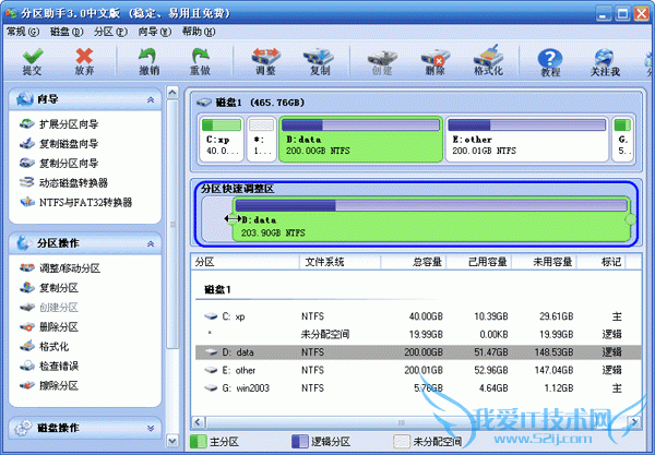 1、下载免费的分区助手,安装并运行它。在主界面上你可以看到C盘有60GB的空间,D盘有200GB的空间,如图1。这个例子将压缩C盘到40GB将压缩出的空间分配给D盘使用,使D盘达到大约220GB的空间。