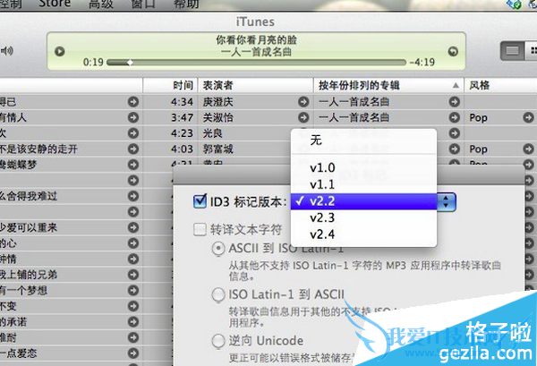 1、把系统语言改成中文,如果你的itune显示中文正常,command+A选择全部歌曲,右击,选择修改id3标签,然后如下图选择id3标记版本,我选择的是V2.2,然后确定,这样就改变id3的版本到2.2版。