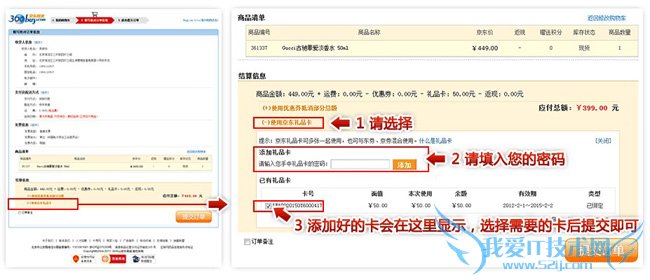 3、在提交订单页中,选择“使用京东礼品卡”,然后输入礼品卡的密码,点击添加即可将礼品卡添加在订单中,然后根据您的需要选择好使用的礼品卡,一次可使用多张,点击提交订单即可完成操作。
