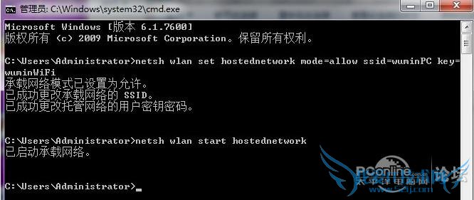 运行命令:netsh wlan set hostednetwork mode=allow ssid=wuminPC key=wuminWiFi