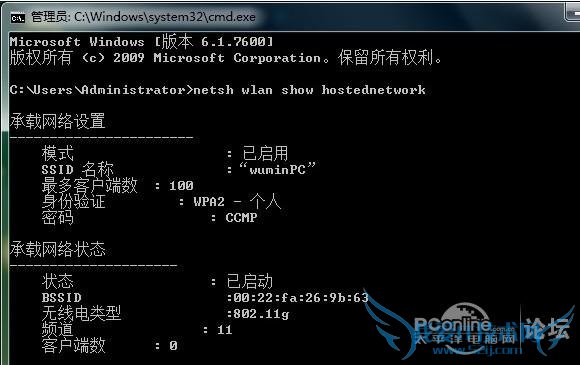 附:显示无线网络信息命令:netsh wlan show hostednetwork