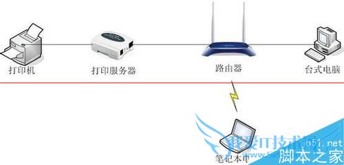 1、以下为通常情况下使用打印服务器的网络结构图。