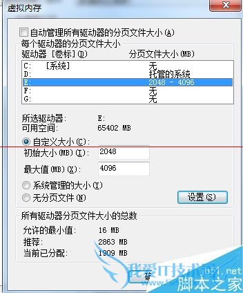 8、我们可以把电脑的虚拟内存设置在其他盘符里面。因为系统默认的是设置在系统盘里面,虚拟内存大小,最好和自己内存大小相匹配。分配完成,点击右下方的设置按钮,我们可以看到上方的盘符已经更改。点击下方的确定,应用此时我们的虚拟内存以及设置成功了。