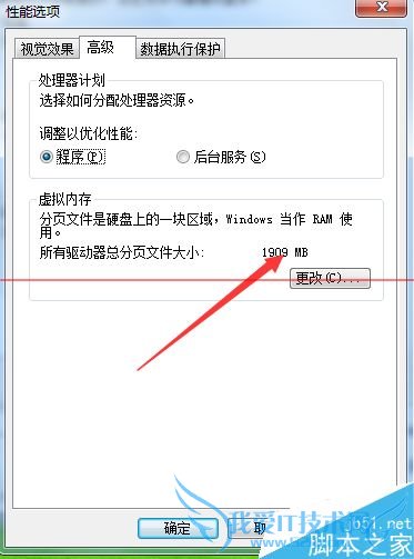 6、进入性能与选项界面,我们可以看到下方的虚拟内存栏,点击下方的更改。