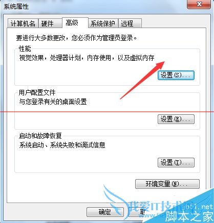 5、点击系统高级设置,会弹出一个系统属性框,我们在上方菜单找打高级,然后在高级列表里找到性能选项,点击性能后方的设置按钮,