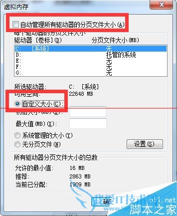 7、进入虚拟内存设置选项,我们在自动管理所有驱动器分页大小前面勾去掉,然后点击下方的自定义大小。
