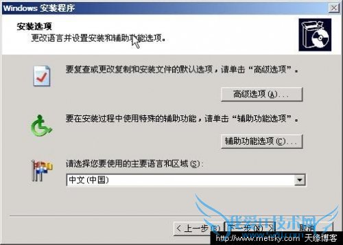 9、这一步是安装语言和区域选择,默认即可,这里我们点击“高级选项”: