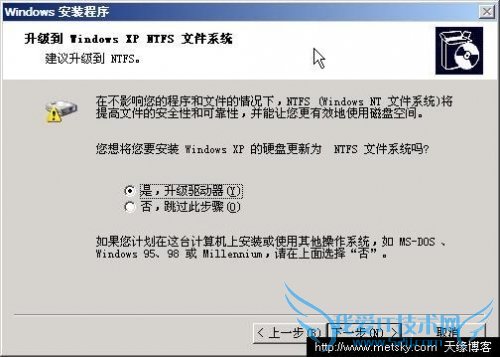 11、这一步提示是否升级到NTFS文件系统,如果系统盘已经是NTFS选择否即可,如果是FAT也可以选择是、否都可以,不确定就点否,跳过,进入下一步: