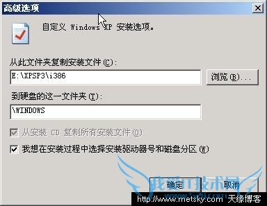 10、高级选项设置图如下,选中我想在安装过程中选择安装驱动器号和磁盘分区一项,点击确定,并点击上图的下一步(特别注意下图中变灰一项,如果是用虚拟光驱安装到这里,一定要选择,从安装CD复制所有安装文件一项,否则再次重启机子就找不到源安装文件了)。