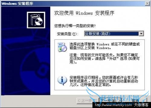 6、选择“安装Microsoft Windows XP”一项,开始安装XP,默认安装类型是升级安装,请改为全新安装(高级)类型,点击下一步。