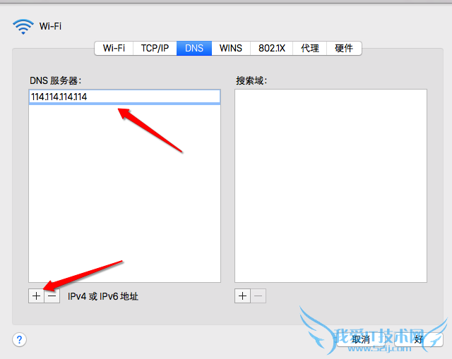 4、随后在 DNS 设置窗口中点击左下方的 + 按钮,添加一个新的 DNS 地址。
