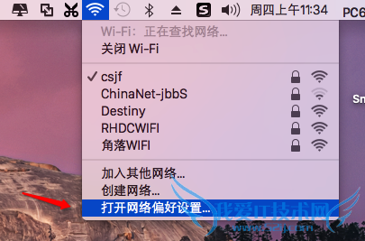 1、在屏幕右上角找到WiFi图标,点击进入“打开网络偏好设置”。