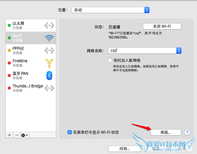 2、在网络设置窗口中,选中当前已经连接的网络,再点击底部的“高级”按钮,如图所示