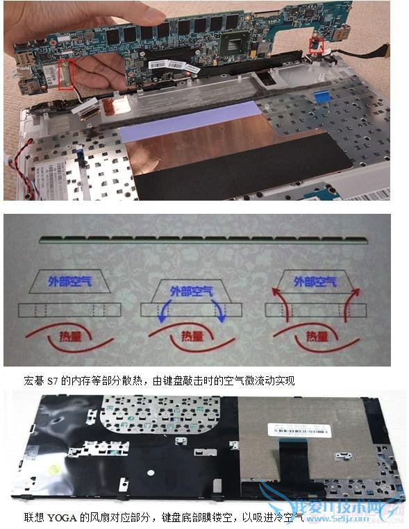 键盘膜是最常见的膜,它既可减少液体泼溅到机内引发故障的概率,也便于阻挡积尘堆积在键盘缝隙里,但并不是所有的笔记本都适合键盘膜。因为不少笔记本都将键盘面作为辅助散热或是冷空气的进口。比如宏碁S7,其内存的散热,就是通过硅脂将热量传导到键盘下方的散热铜片上,依靠敲击键盘时的气流流动来进行散热。而在联想YOGA上,其风扇对应位置的键盘上也有镂空设计,这说明其部分冷空气是由C面吸入,以保证风道的畅通。
