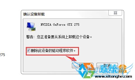 6、出现卸载对话框后,我们必须勾选“删除此设备的驱动程序软件”选项,然后选择“确定”;