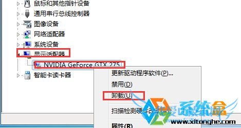 5、然后在设备管理器的硬件列表中找到“显示适配器”并展开,右键点击其中的项目(显卡),选择卸载;