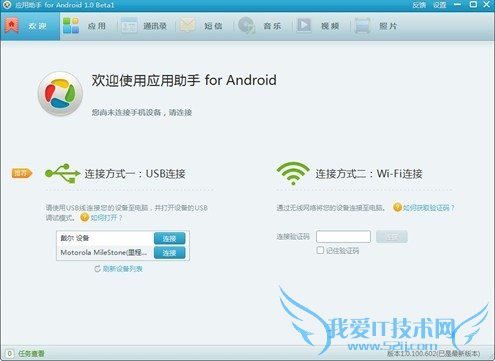 应用助手for Android只有6.47M,相比其他同类软件的16M大小,可谓是小巧玲珑。也就是因为这个比较“浓缩”的体积,让这款软件运行起来速度很给力,运行中之占内存18M,而同类软件内存耗用多在100M以上。连接手机之后,可以迅速检测出手机型号,笔者测试了摩托罗拉里程碑、中兴N600都轻松识别,还可以通过USB和WIFI两种方式连接。