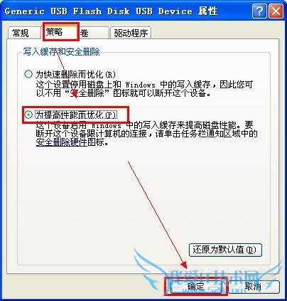 3 在打开的窗口点击“策略“选项卡。将策略改为“为提高性能而优化”。确定即可解决被写保护的问题。