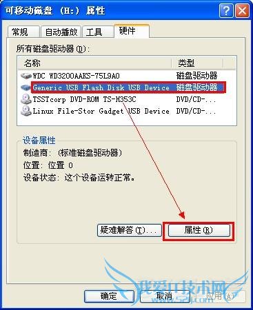 2 在所有磁盘驱动器列表中选择名称含有USB的磁盘驱动器,单击右下方的“属性”按钮。