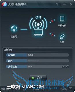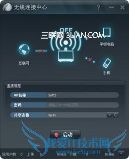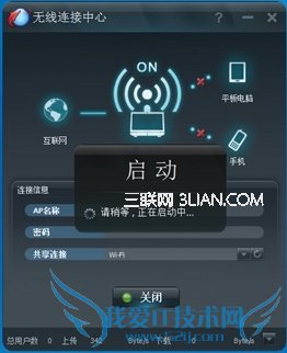 2. 双击1中所示的图标(无线连接中心),打开后,发现如下界面,在AP名称和密码处设置相应的名称和密码(密码为8–63 个字符,这个名称和密码只能在连接没有启动时可以更改,连接启动后就不能更改)。然后选择共享连接,选择共享连接时需要注意:请选择当前已经连接到网络的连接方式,如:本地连接(Win8系统下叫做以太网)、无线网络连接(Win8系统下叫做Wi-Fi)或宽带连接,点击启动即可,如下图: