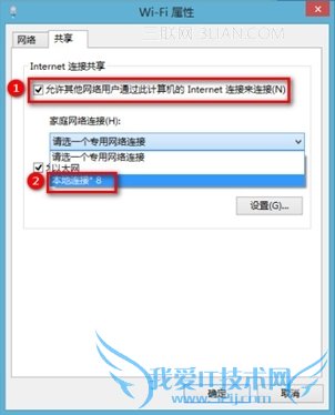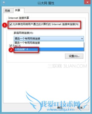 在本地连接(Win8系统中为以太网)图标上右击然后选择“属性”,然后勾选“允许其他网络用户通过此计算机的Internet连接来连接(N)”,在下拉菜单中选择本地连接*8(此连接为在开启无线连接中心后出现的虚拟网络适配器)如下图: