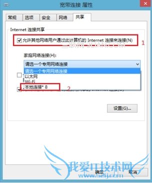 然后选择共享连接,选择共享连接时需要注意:请选择当前已经连接到网络的连接方式,如:本地连接(Win8系统下叫做以太网)、无线网络连接(Win8系统下叫做Wi-Fi)或宽带连接。使用不同上网方式,共享设置位置不同,一般分为三种: