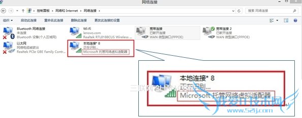 在启动无线连接中心后,找到网络连接(右键点击桌面右下角的无线网络图标---打开网络和共享中心---更改适配器设置)中会出现一个含有“虚拟网络适配器”字样的“本地连接”图标,如下图: