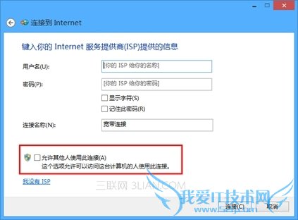 注意:家庭使用上网连接是PPPOE模式(例如ADSL 拨号上网连接),在建立连接时,需要勾选“允许其他人使用此连接”选项。如下图: