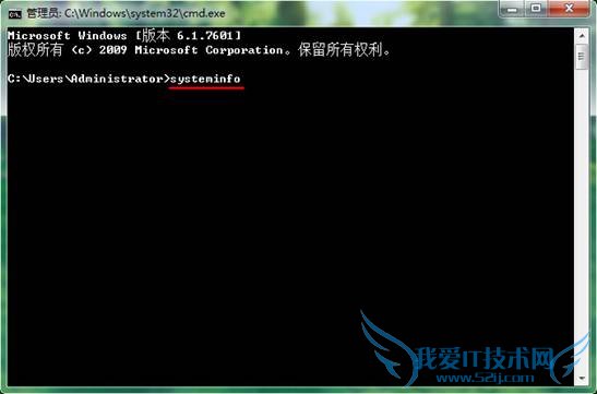 3、进入管理员命令提示符窗口,直接输入“systeminfo”命令,按下回车键执行,如下图所示: