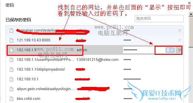 第4步:在打开的“已保存的密码”窗口中,找到自己曾经设置过的网址并单击选中,然后就可以直接在后台单击“显示”按扭,就可以把已保存的******星号密码变成可看到的文字了。