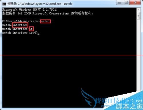 2、在命令提示符中依次输入"netsh"--->"interface"--->"ip",并依次回车。