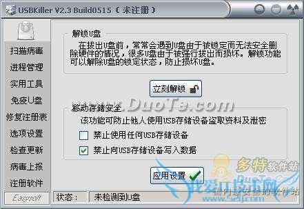 U盘病毒专杀:启动USBKiller,界面如图1所示,点击“开始扫描”就可以扫描U盘里是否有毒。有的话就杀掉。