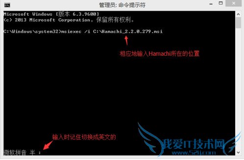 2:在”命令行提示符“里输入:msiexec /i C:Hamachi_2.2.0.279.msi(注意空格和不要使用中文标点符号,红色字体是跟你的版本一致的),这样就可以用管理员的权限打开安装程序了。