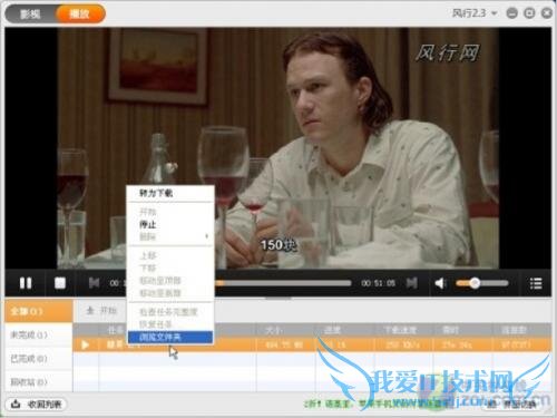 图 3 当高清电影在线完整播放一遍或是表示下载进度的那个橙色指示条到达风行软件播放窗口右侧顶点时,表明高清电影已经下载完成,这时只要在播放窗口的左下方单击“展开列表”标签(界面风格为“经典模式”),然后右键单击对应的任务项,在打开的右键菜单中选择“浏览文件夹”(如图4)。