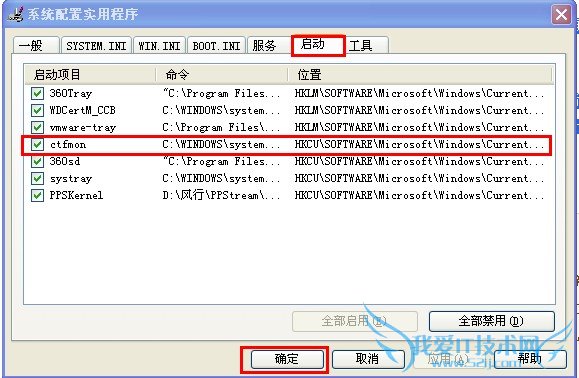 2.点“开始→运行”,键入“msconfig”回车,运行“系统配置实用程序”,在“启动”选项卡中把“Ctfmon.exe”选中,单击“确定”,然后注销或重新启动应该就可以了,如图: