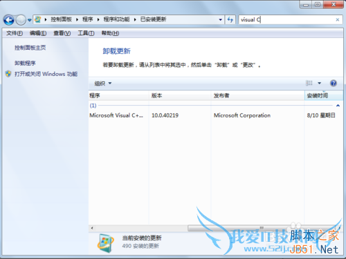4、进入控制面板程序中,查找软件,发现小编的机器上的确有个Vs2010,估计还打过版本,但居然没有上述dll文件。