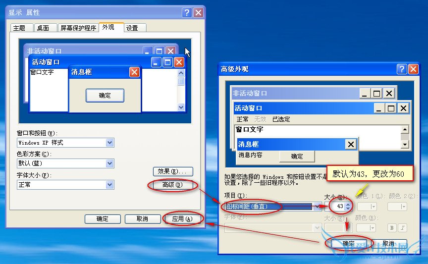 在“显示属性”窗口“外观”选项卡中单击“高级”,打开“高级外观”窗口,在“项目”下拉列表中选择“图标间距(垂直)”,然后更改大小为60(该数值可根据实际需要修改),然后单击“确定”即可,注销或重启后生效,如下图所示: