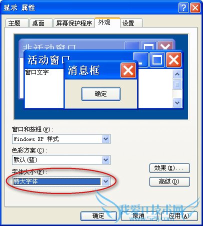 设置完成后如果感觉字体偏小,可以更改字体大小显示为“大字体”或者“特大字体”,单击“应用”后生效,如下图: