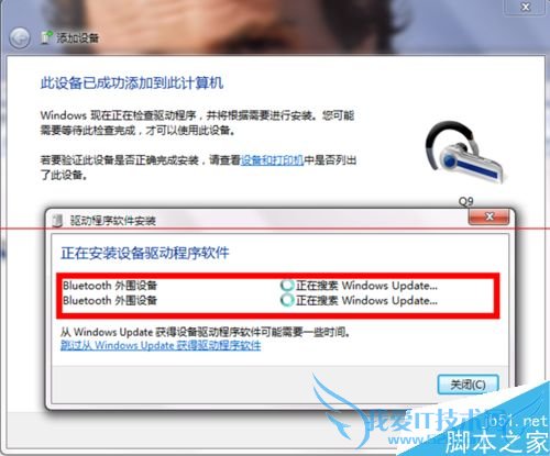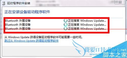 5、进入下一步后,就会发现蓝牙耳机开始搜索相对应外围驱动设备。此时很多朋友你们的电脑会出现无法搜索到相关程序设备。是由于系统蓝牙驱动版本过低或者使用精简版系统,这时需要操作的是更新笔记本电脑蓝牙驱动程序。