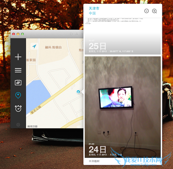 同一天的日志会被归在同一个栏目里,左侧有一个醒目的 Icon 化功能导航,可以通往日记编辑,Timeline,日历浏览,地图浏览,提醒这5个频道: