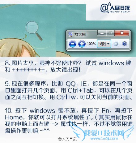还有几招实用的,你也不妨使用键盘操作,学一学稍微酷一点的做法。比如要找电脑上的文件时,一般人会先找到“我的电脑”,然后点击打开,而高手总是很酷的,轻轻按下键盘上的windows键不放,然后再按E键,直接打开电脑的资源管理器,而一般人还在慢慢寻找“我的电脑”图标呢,嗯,高手就是这样直接把一般人给秒杀了的。还有按下windows键不放,再按下Fn,再按下Home,你就可以打开系统属性了。其实用鼠标在我的电脑上面右键,打开属性也一样,不过不觉得用键盘操作更帅嘛!不动用鼠标的情况下,你绝对可以用键盘搞定。比如快速缩小文字Ctrl+Shift+,Ctrl+F5在IE中强行刷新,保存Ctrl+S,关闭程序Ctrl+W,新建Ctrl+N,打开Ctrl+O,原来这些常规操作你都可以用键盘搞定。