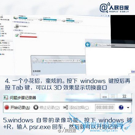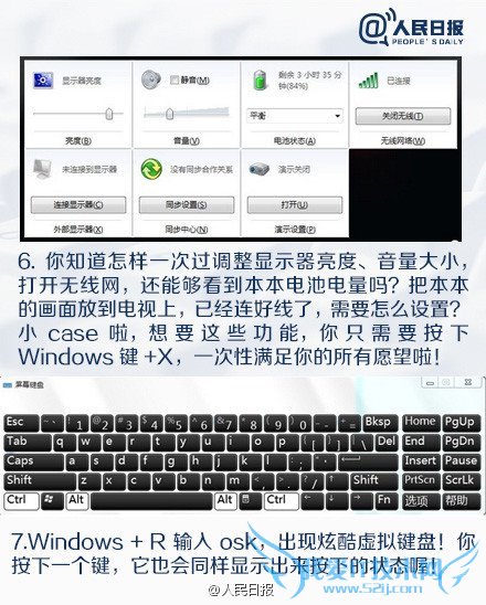 对非电脑专业人士来讲,该帖还科普了一些令人有些意外的用法,彻底揭开“键盘上的秘密”。比如你知道怎样一次过调整显示器亮度、音量大小,打开无线网,还能够看到本本电池电量吗?把本本的画面放到电视上,已经连好线了,需要怎么设置?小case啦,想要这些功能,你只需按下windows键和X,一次性满足你所有愿望!你知道吗?windows还自带录像功能。按下windows键和R,输入psr.exe回车,就可以开始记录了。图片太小,眼神不好使咋办?试试windows键和+++++++++,就会出现放大镜!还有一些蛮炫的小花招哦,按下windows键然后再按Tab键,可以以3D效果显示切换窗口。windows键和R输入osk,会出现炫酷虚拟键盘!