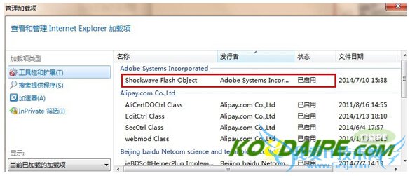 第三步:在“管理加载项”里启用“Shockwave Flash Object”,如图3: