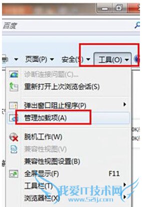 第二步:下载安装完之后,要在浏览器里启动插件,如图2,找到浏览器“工具”—“管理加载项”:如图2所示