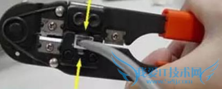 将水晶头放入压线钳的压头槽内,准备最后的压实。双手紧握压线钳的手柄,用力压紧