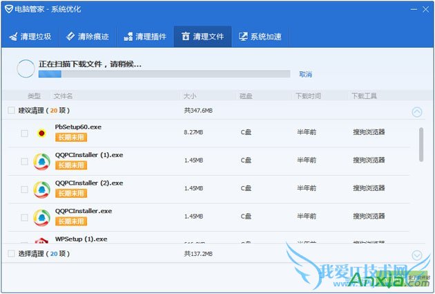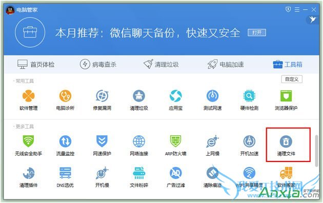 打开管家主界面,点击“清理垃圾”,在右下角有“清理文件”的入口,点击后即可打开“清理文件”功能,或者您也可以在工具箱中打开。